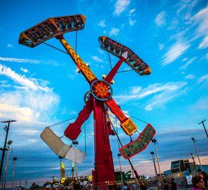 6:00 p.m.- Human Cannonball Daredevils Show behind amusement rides in park.